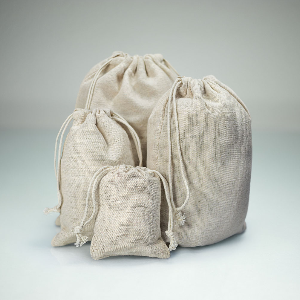 Las bolsitas de lino con cordones están disponibles al por mayor para el Reino Unido y Europa.